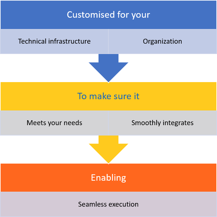 You can rely on our experience to ensure that all new components are implemented in a professional way, that they smoothly integrate in your environment and that they seamlessly execute.